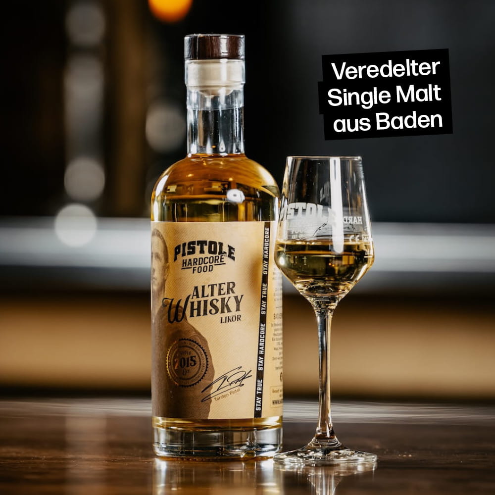 Alter Whisky ist ein badischer Single Malt, der mit Rohrzucker veredelt wird und so zum Likör wird. Du bekommst Whisky-Charakter, aber ohne das typische Brennen im Mund. Schon in der Nase kommt eine leichte Honignote mit einem Hauch Rauch. Am Gaumen bleibt es angenehm rauchig, dazu eine feine Süße und eine klare Vanillenote. Wenn du Whisky magst, aber nicht immer die Fassstärke brauchst, triffst du hier ziemlich genau die Mitte.